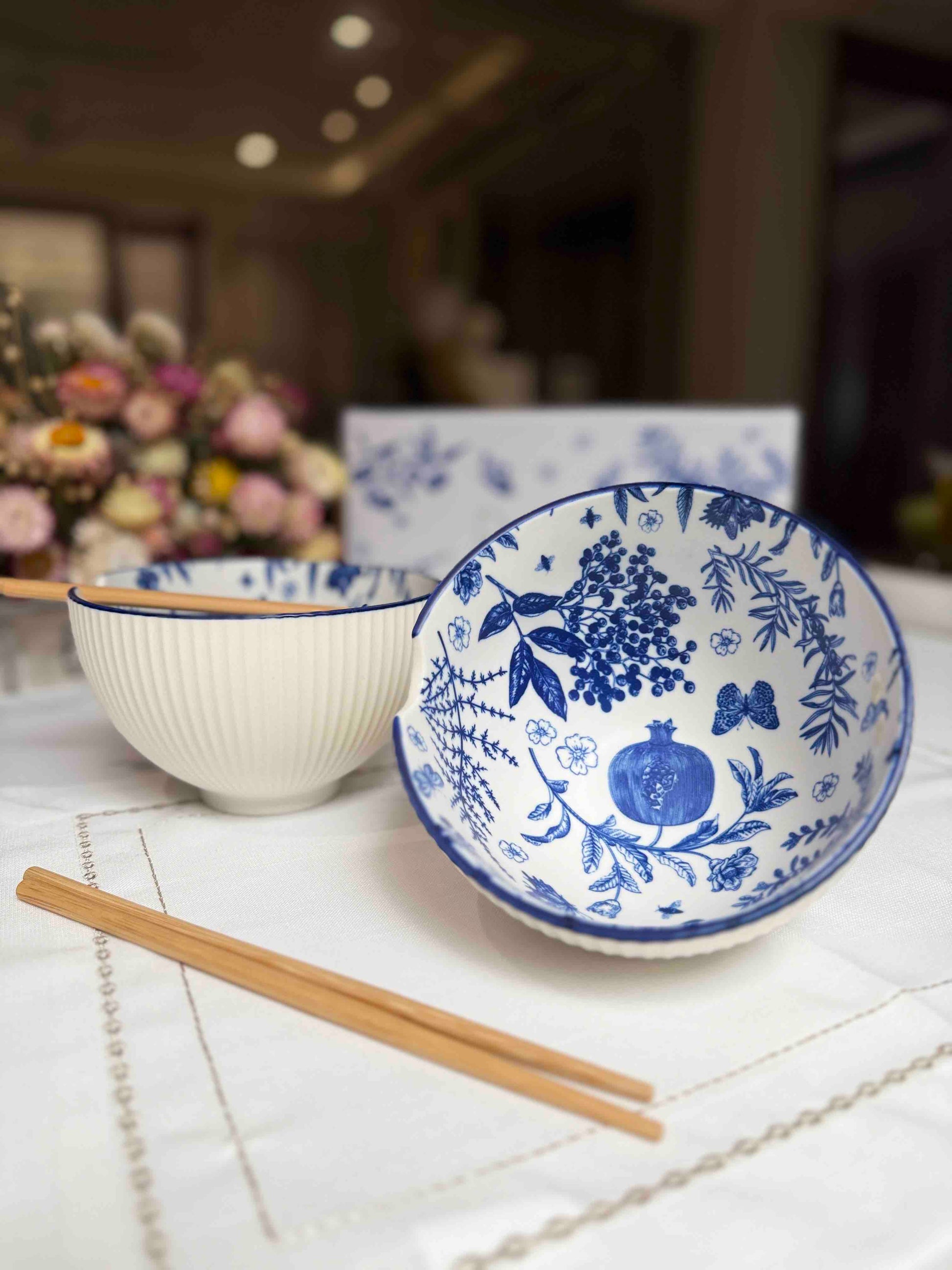 Elevate your dining experience with the Sakura Indigo Ramen Bowl Set. Featuring a ribbed white exterior and a delicate indigo floral design inside, this set blends traditional artistry with modern elegance. Each bowl includes a pair of wooden chopsticks with a built-in holder, making it perfect for serving ramen, noodles, pho, or rice dishes. A timeless piece that brings both beauty and functionality to your table.
