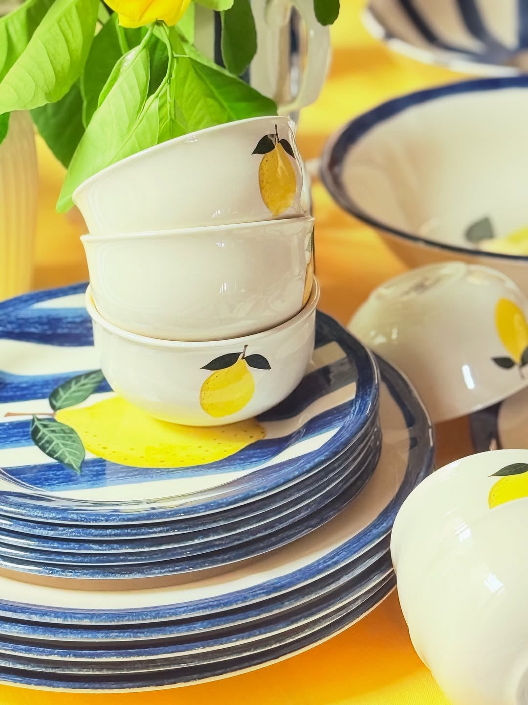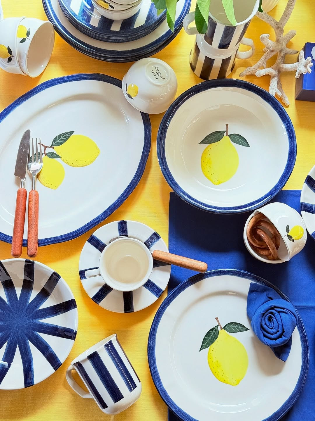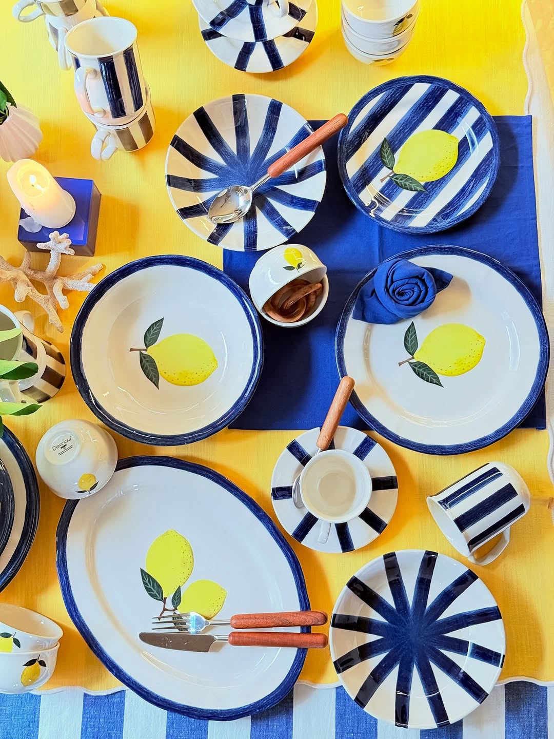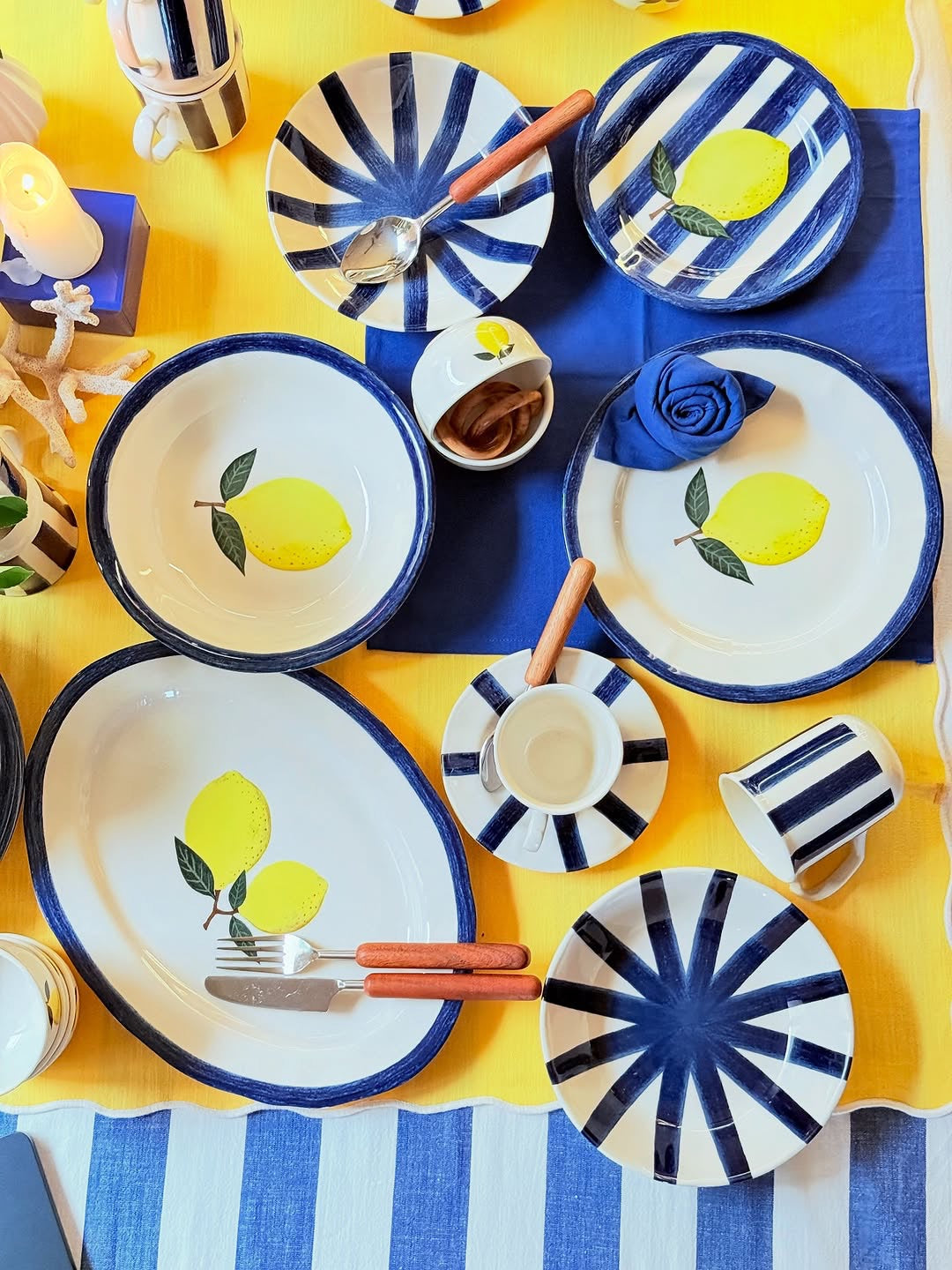 Bring the charm of the Mediterranean to your table with our Sorrento Citrus Collection. Featuring hand-painted lemon motifs paired with classic blue stripes, this collection captures the essence of sun-drenched summer dining on the Amalfi coast.