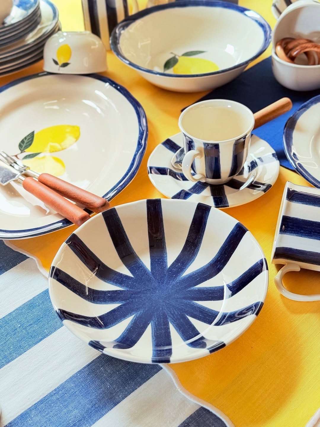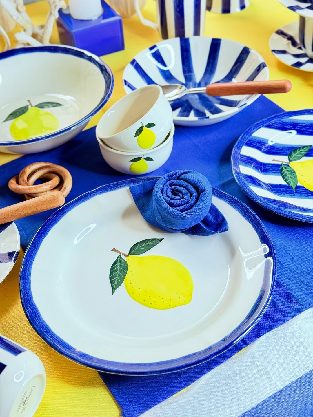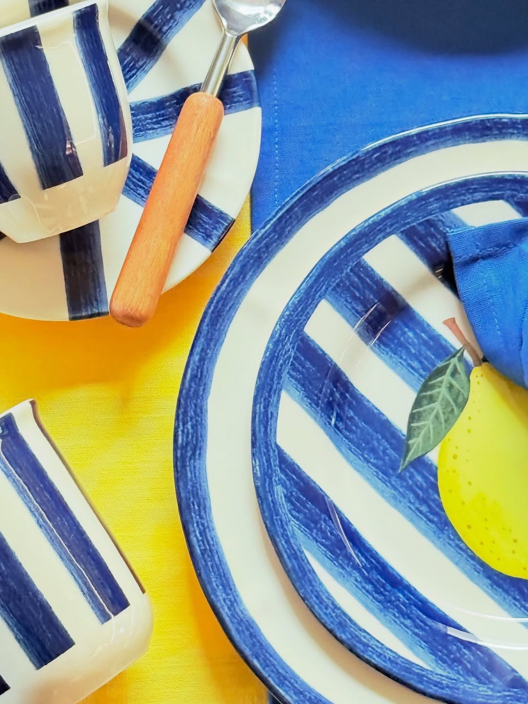 Bring the charm of the Mediterranean to your table with our Sorrento Citrus Collection. Featuring hand-painted lemon motifs paired with classic blue stripes, this collection captures the essence of sun-drenched summer dining on the Amalfi coast.