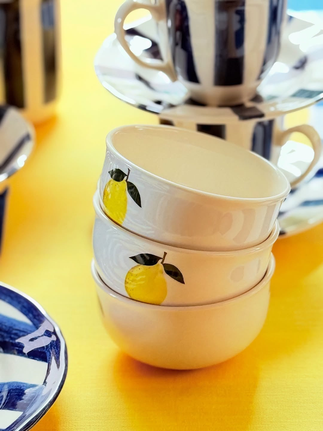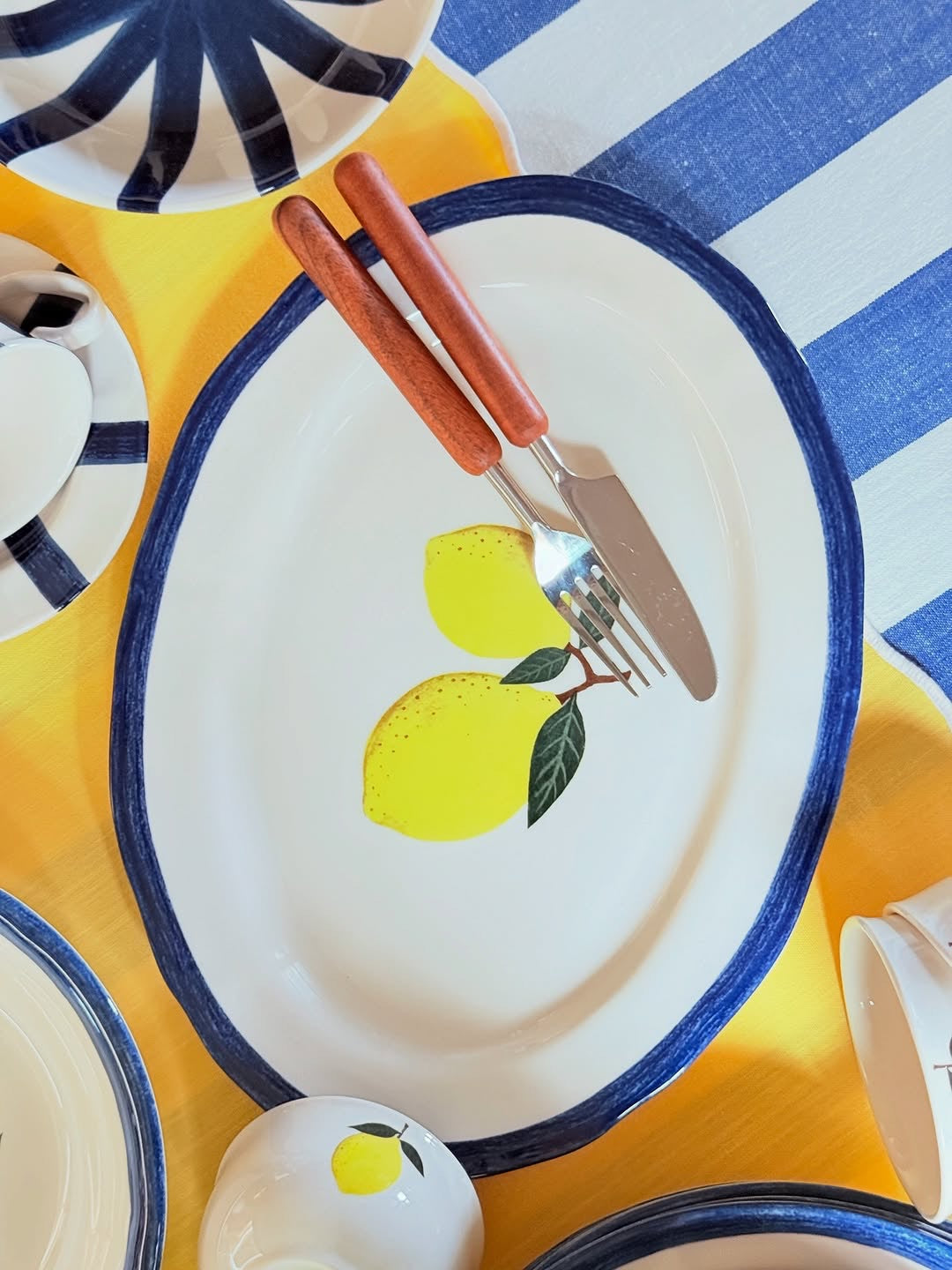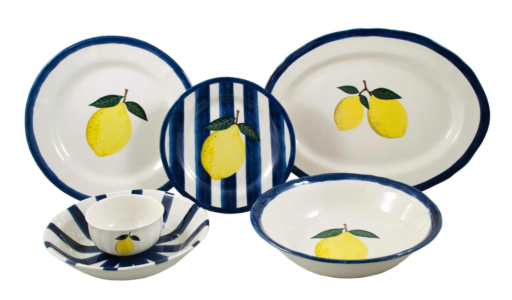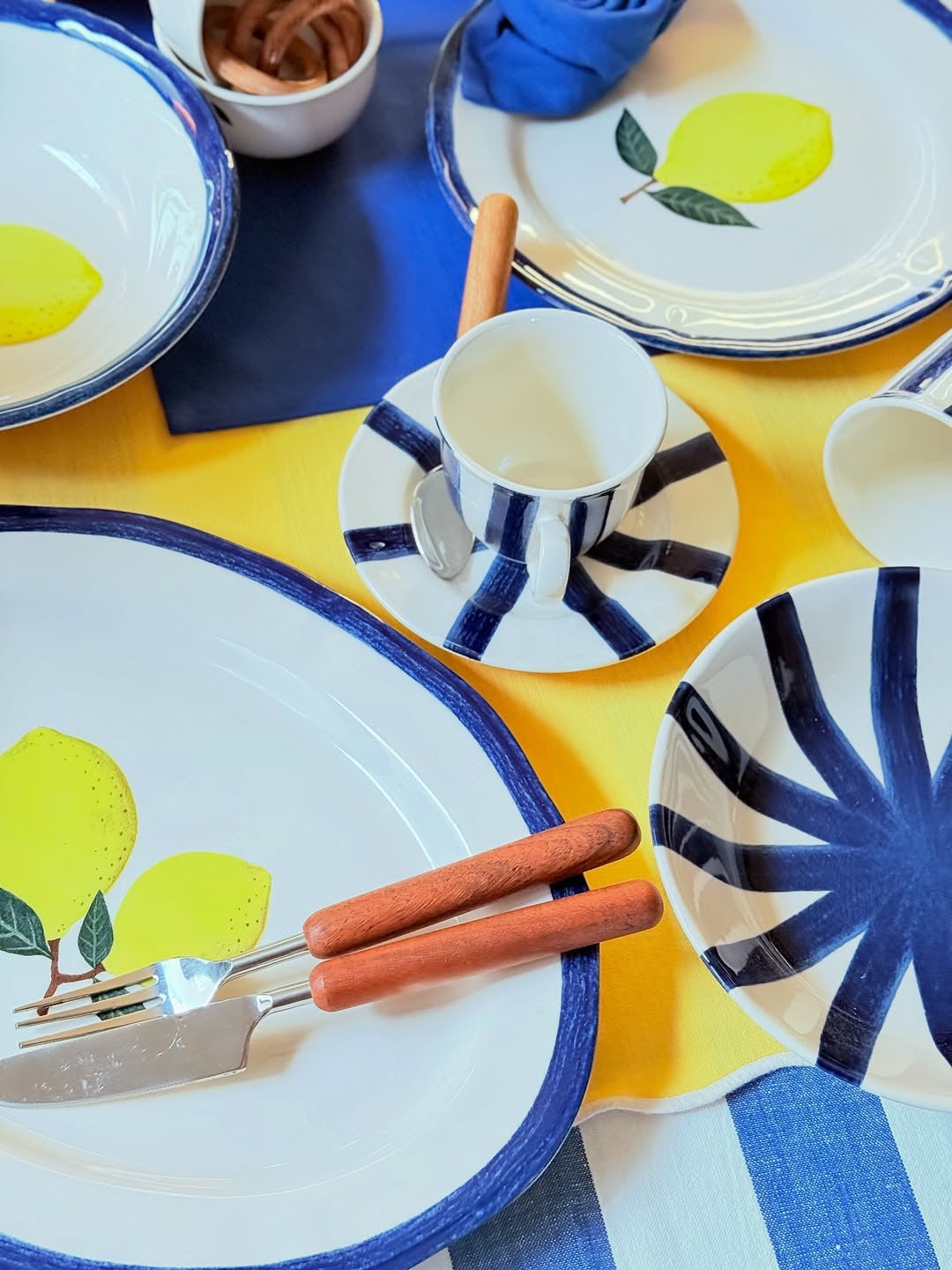 Bring the charm of the Mediterranean to your table with our Sorrento Citrus Collection. Featuring hand-painted lemon motifs paired with classic blue stripes, this collection captures the essence of sun-drenched summer dining on the Amalfi coast.