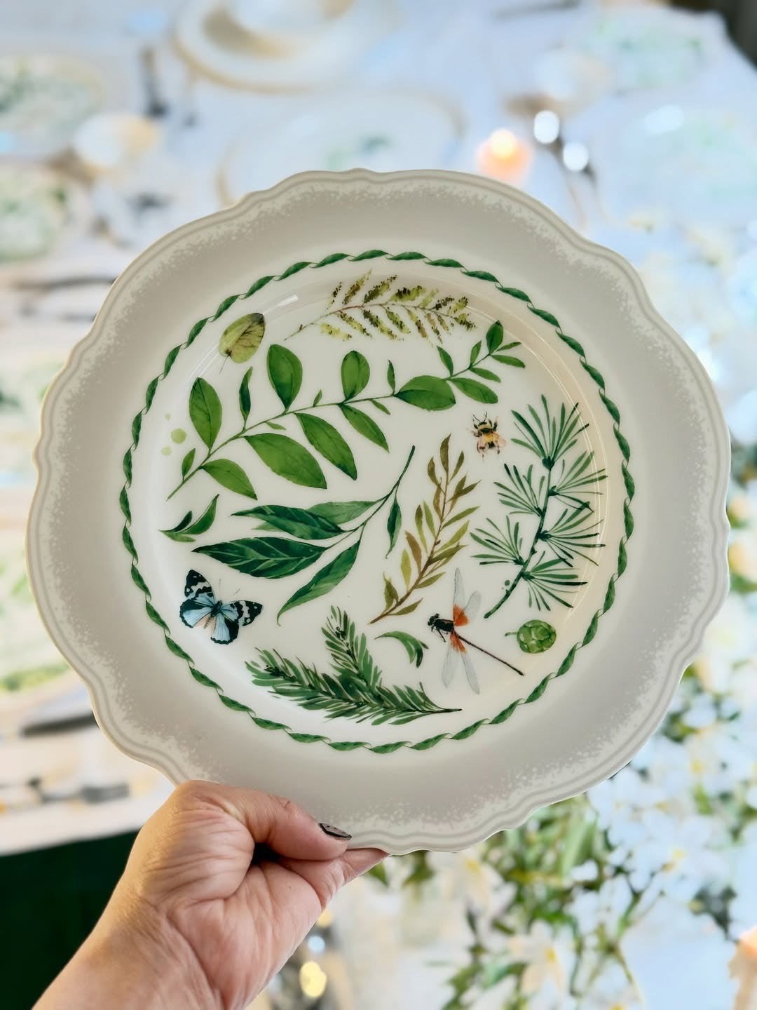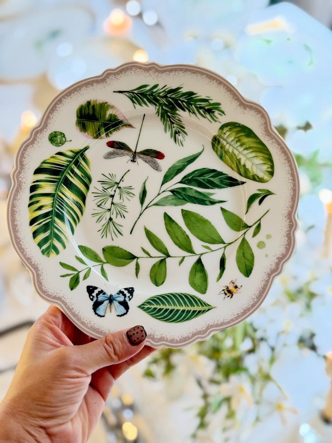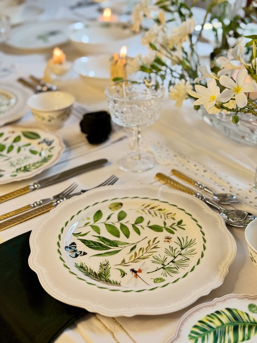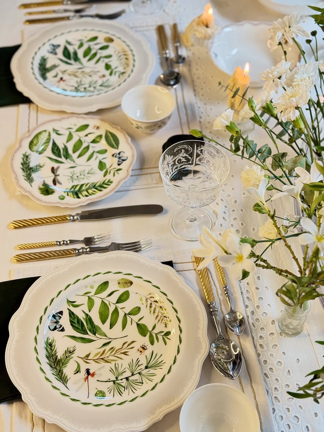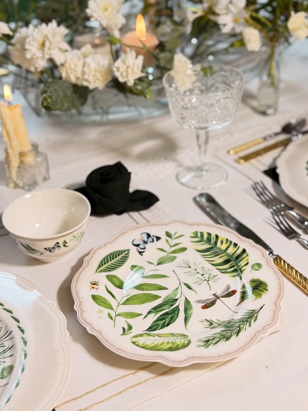 Step into nature with the Verdant Garden Collection, where lush greenery and delicate botanical motifs bring the beauty of the outdoors to your dining table. With intricate details of leaves, florals, and tiny woodland creatures, this set creates an enchanting tablescape for every occasion.